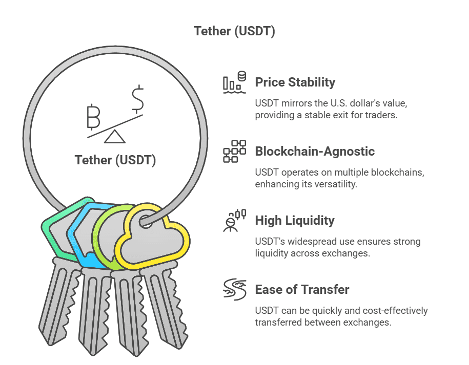 - Price Stability: USDT is meant to mirror the value of the U.S. dollar closely. This relative stability provides traders with a “safe harbor” to exit the volatility of other cryptocurrencies without converting back to fiat.
