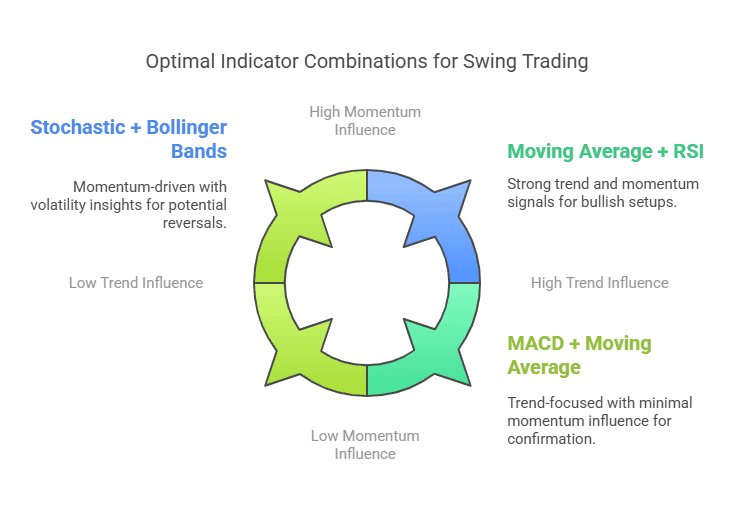 - Trend + Momentum: Combine Moving Averages (to identify the overall direction) with RSI or Stochastics (to gauge if an asset is overbought or oversold). If the price is above a 50-day SMA and RSI is crossing up from below 30, it could signal a bullish swing setup.