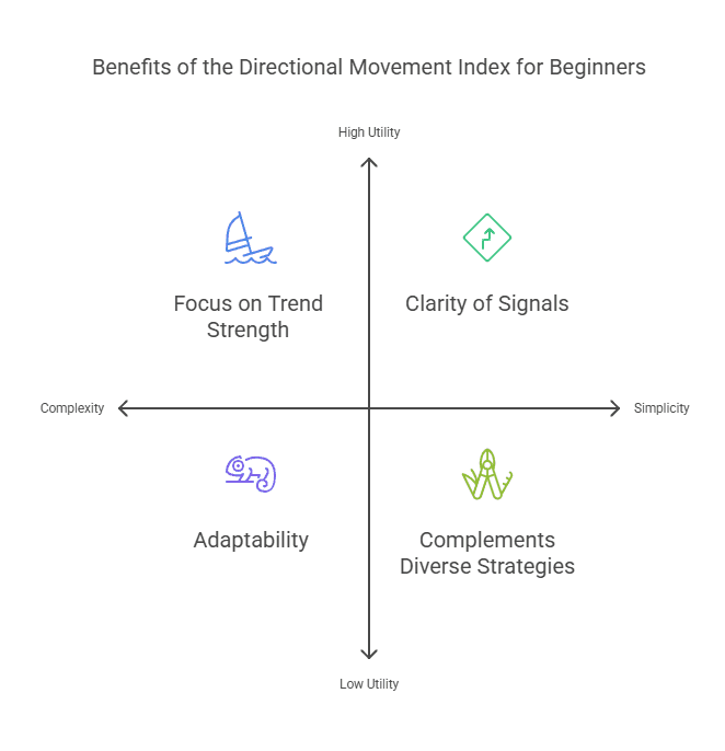 Because the DMI’s components are relatively intuitive, it helps new traders build confidence quickly. When +DI is on top and ADX is rising, it’s a straightforward bullish environment. When -DI is on top with a strong ADX, the trend is bearish. This simplicity can help beginners learn to trust their signals and develop discipline—both of which are critical for long-term success.