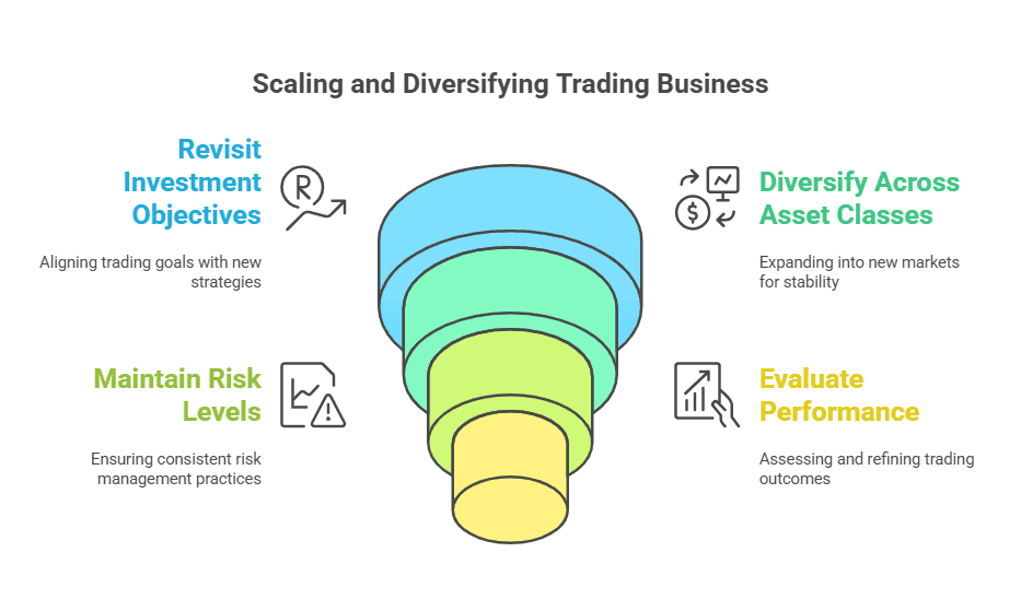 As you gain more confidence and improve your trading skills over time, you may wish to expand your trading business. That can include exploring additional asset classes, deploying new strategies, or increasing your capital allocation. However, scaling up requires the same structured mindset and careful risk assessment.